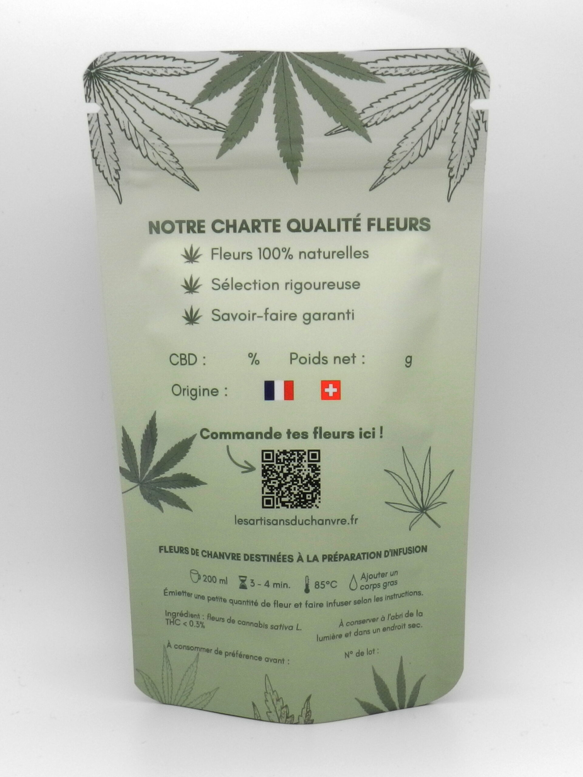 Ce sachet est vendu scellĂ© et Ă  titre d’infusion. Les Artisans du Chanvre se dĂ©douanent de toute responsabilitĂ© une fois cet emballage ouvert et utilisĂ© pour un usage diffĂ©rent.